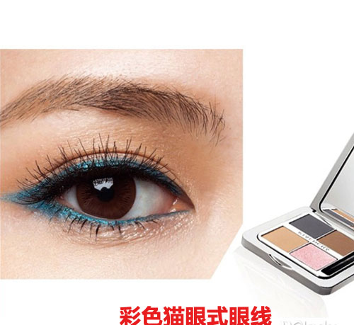 彩色貓眼式眼線 挑選飽和、低明度的彩色眼線,以全框式上揚貓眼畫法展現性感,輔以黑色內眼線和濃密的上下睫毛來強調深邃感。因東方人眼皮較厚,在眼窩、眉頭下方、眼尾上方以霧面棕色眼影創造陰影,展現立體輪廓。韓星很重視能招人緣的臥蠶,以淺色珠光眼影打亮下眼瞼,呈現眼妝亮點,也柔和全框式眼妝的利落感。