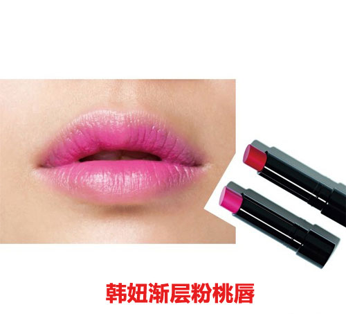 韓妞漸層粉桃唇 唇膏質感挑選以半霧面為主。先拿淺粉紅唇膏打底,手指拍抹一下唇周,讓唇線不明顯才顯年輕,再用唇刷沾桃紅色唇膏,同樣拍抹方式上色在嘴唇中央,最后再以指腹在桃紅色邊緣輕點,讓深淺兩色自然融合。