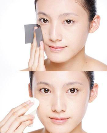 Step2:用吸油面紙輕壓肌膚,特別是鼻兩側(cè),這樣能延長脫妝時間。然后用海綿蘸取少量的蜜粉,從T區(qū)向臉頰輕拍,增加霧面質(zhì)感。