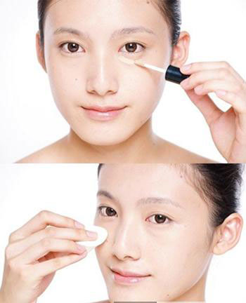 Step3:肌膚瑕疵比較多的人就需要用遮瑕膏,在黑眼圈和痘印都地方輕點,指腹輕輕打圈推開。最后再次用海綿蘸取蜜粉,在遮瑕過的局部輕拍按壓,這樣肌膚就完美了。
