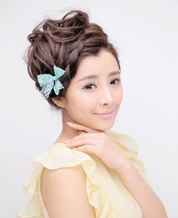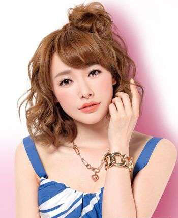 亞麻色的波浪卷齊肩發(fā),卷卷的發(fā)絲搭配側(cè)分劉海分外甜美可人,但款式未免通俗。一側(cè)頭頂?shù)膯芜吇ò^成為點(diǎn)睛之筆,盤繞蓬松的發(fā)髻顯得俏皮又清涼。