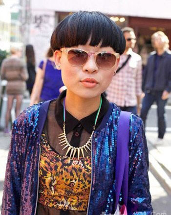 這款短BOBO發型充滿復古風,不規則的齊劉海很好的修飾了長臉缺陷,為這款造型增添了一絲俏皮,弧度修剪得很飽滿的短發看起來很甜美可愛,搭配一件閃亮外套