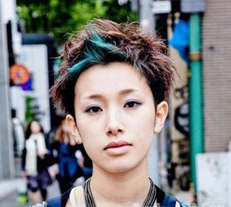 這款女生短發很有個性,栗色的染發和綠色的挑染顯得帥氣無比,采用紋理燙的頭發顯得十分的有質感,劉海的部分全部往上抓,看起來很修飾臉型,搭配一件帥氣的上衣給人感覺很干練、清新