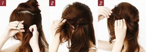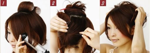 Step2:把頭頂處頭發(fā)暫時固定以下,然后把剩下的頭發(fā)向內(nèi)卷用卡子固定。