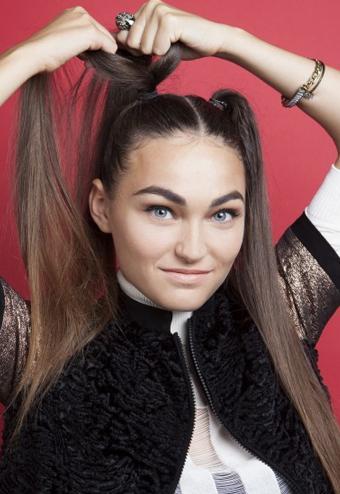 把頭發(fā)中分,分別梳兩個(gè)高馬尾,注意要綁的緊一些。