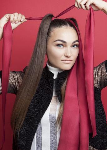 取兩條長長的發(fā)帶,注意發(fā)帶至少要比自身頭發(fā)長一倍,這樣才夠編發(fā)使用,分別系在左右兩邊的馬尾底端。