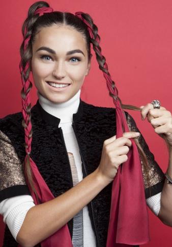 把頭發(fā)和緞帶編在一起,在最底端部分,留一節(jié)用小的皮繩綁緊,可以把多余的緞帶剪掉。