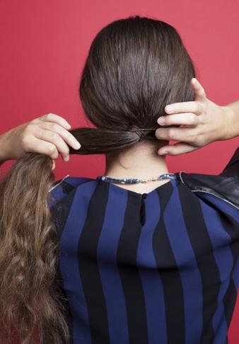 用手指隨意梳開卷發(fā),梳一個(gè)較低的馬尾辮。把馬尾均分成2份,用梳子把馬尾的部分依次打毛,使頭發(fā)看起來很蓬松。
