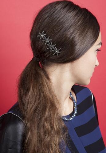 最后加一個(gè)滿天星的發(fā)夾在一邊耳后,靠近馬尾的地方,這樣一款星星發(fā)夾打造的馬尾就完成了,你也可以用秋冬流行的金屬色系或是寶石發(fā)夾作為代替,效果同樣出眾。