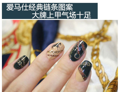 ★ STEP 6 等待干透后再涂上一層透明的甲油封層,使甲油可以保持更久。 這樣一款愛馬仕的經典鏈條and小馬圖案的美甲教程就完成了哦,是不是很大牌呢!