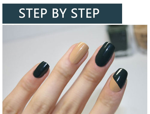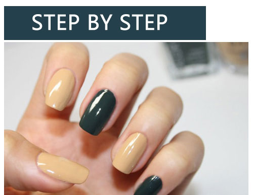 ★ STEP 1 在完成透明甲油打底之后,在拇指和食指,無名指的指甲上涂上裸色的指甲油,中指和尾指涂上墨綠色的指甲油。