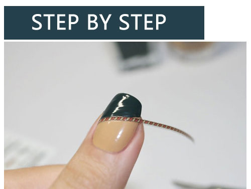 ★ STEP 2 食指盒大拇指的裸色指甲油上再涂上一層斜法式的墨綠色指甲油。