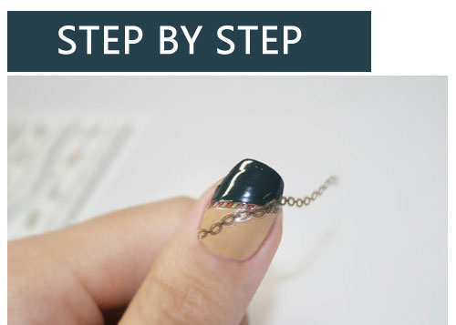 ★ STEP 5 按照這種方法,在所有指甲上都貼上鏈條和小馬的貼紙,打造出愛馬仕經典絲巾的圖案。