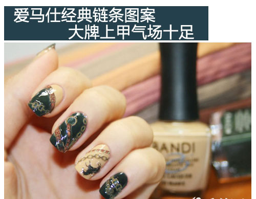 想做一款大牌氣質的美甲卻無從下手,其實照搬大牌經典的圖案就是最好的選擇,今天小編就教你這款大牌愛馬仕經典鏈條圖案的diy美甲教程,無難度零基礎自制,讓你簡單高端大氣上檔次。 首先要準備的是墨綠色的指甲油和裸色的指甲油。 其次這種美甲貼紙在網上都能輕松淘到,而且價格也很實惠,一張就能用好幾次,性價比很高哦!