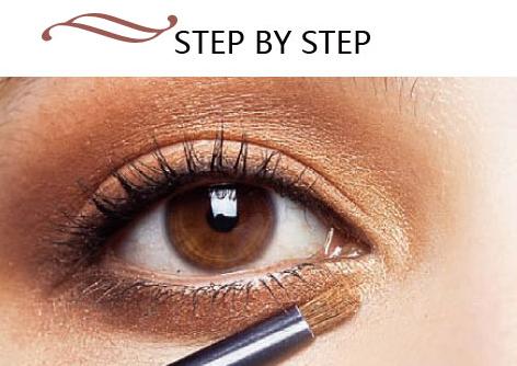同步驟2的咖啡金色,描繪下眼影,眼尾部分暈開與上眼影連結(jié)。在眼頭「ㄑ」字涂抹淺金色眼影,製造眼妝亮點,打造晶亮感眼神。