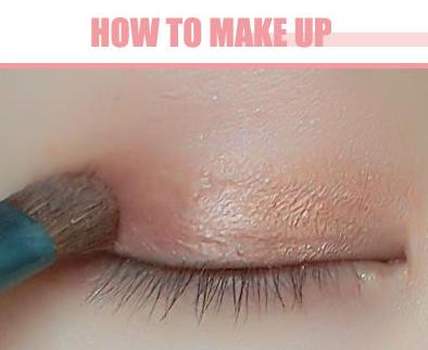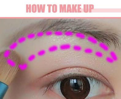 步驟二:接下來是眼妝部分,首先用粉色眼影大面積涂抹到上眼皮處,利用疊加的眼妝畫法,在雙眼皮褶皺內(nèi)掃上大地色眼影。