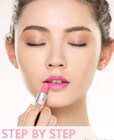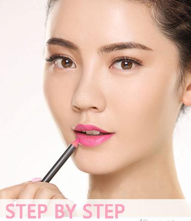 因為嫩粉色屬于膨脹型顏色,所以依舊不要畫得過于飽滿,唇中可以沿著自己唇形勾畫,嘴角不要畫的過滿。使用嫩粉色的唇膏涂滿整個唇部,如果嘴唇過于干澀,可以最后加一層透明的唇蜜在唇膏上,這樣就可以擺脫冬日帶來的干澀感!
