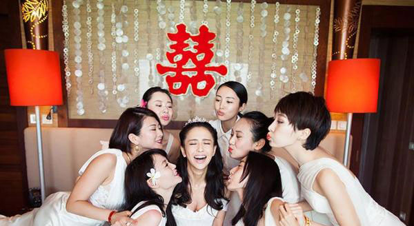 佟麗婭的華麗伴娘團,做為主角的佟麗婭坐在床上正中間,伴娘們相互做出親吻的姿態。女神黑色微卷長發,頭頂配戴白色鑲鉆王冠,華麗不失甜美,宛若出嫁的貴公主哦。