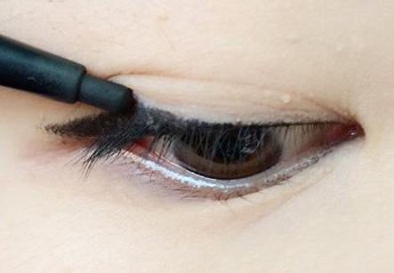 1、眼線筆填實(shí)睫毛根部和內(nèi)眼瞼,眼尾稍許上揚(yáng)。