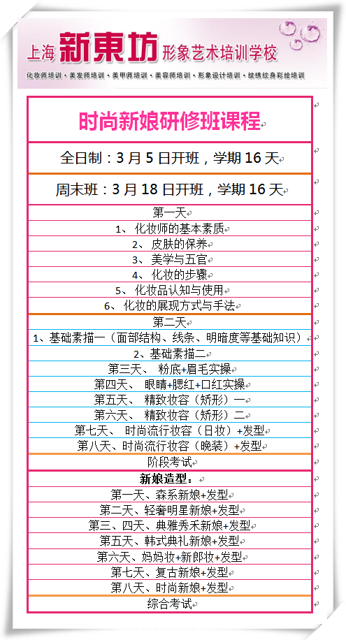 新東坊針對:美容師培訓,化妝師培訓,美甲師培訓,美發師培訓,形象設計師培訓,初級、中級、高級、技師、高級技師培訓,就業培訓、創業培訓,新娘彩妝培訓、影視化妝造型培訓、白領形象設計培訓、演員明星各種造型、各種主持人模特造型,芳香美容專項。