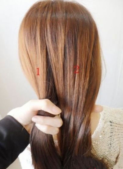 長發(fā)披肩,理順之后,均分為兩份,如圖示1和2。