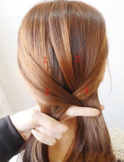將3和4股兩屢頭發(fā)開始編起,并不斷從1和2中加些頭發(fā)進來,注意保持1和2的位置不變。