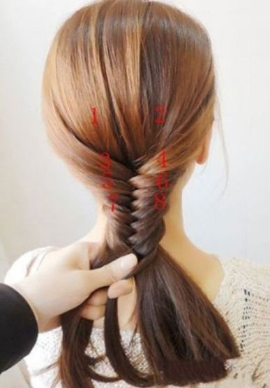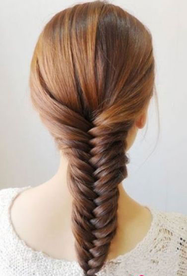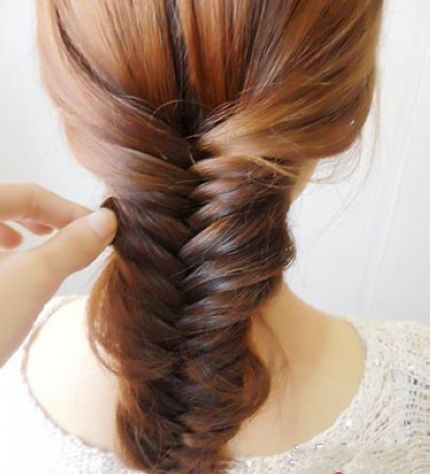 按照此種規(guī)律,一直把頭發(fā)往下編,逐漸地,便呈現出很好看的細魚骨紋路來。