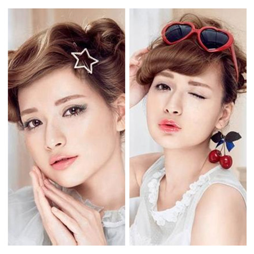 內扣式劉海:長發在腦后兩側分別被綁成兩個鼓鼓的發髻,長劉海為了配合發髻也被打造成內扣的蓬松造型,發型即利落又可愛。 外翻劉海:溫柔的微卷長發,將額前的長劉海翻轉到腦后,然后用大大的蝴蝶結造型發夾將劉海固定在腦后,發型很簡單卻又不失精致小女人的感覺。
