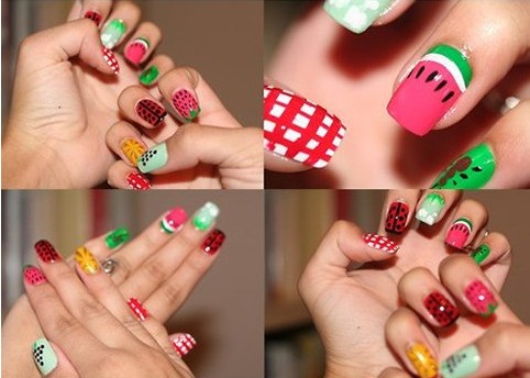 首先為大家送上的是這款可愛的美甲,它是由眾多的具有夏日元素的圖案組成的,有西瓜,草莓,瓢蟲等等。每一個圖案都有著極其鮮艷的色彩,各類元素集中在指尖上顯得非常的和諧和熱鬧。如此一款艷麗奪目,可愛自然的美甲圖案,你喜歡嗎?
