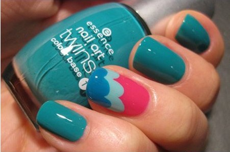 屬于夏日的色彩,我們又怎么可以少了湖水綠色的指甲顏色呢。大片的湖水綠色甲油均勻地涂抹在每個指尖,讓人感受到絲絲的清涼。選取其中一個指甲做些小裝飾,畫上了桃紅色,薄荷綠色和天藍色組成的波浪圖案,如海水般充滿動感。