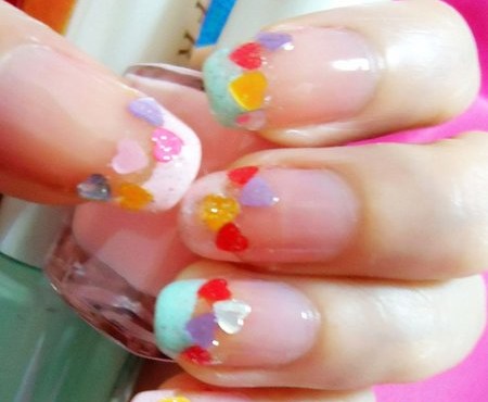 最后要為大家介紹的可愛美甲是這樣一款。薄荷綠色和粉紅色打造的法式指甲。先涂上一層透明的指甲油,然后在指尖的位置畫上薄荷綠色和淡粉紅色的甲油,接著是把顏色各異的小小心形閃片,讓指甲看上去更加的繽紛可愛。(本文由上海化妝培訓(xùn)學(xué)校整理辯解)